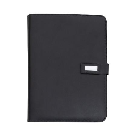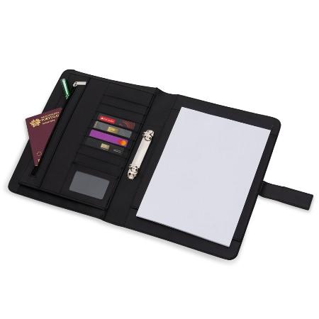 Pasta convenção com fecho imantado e plaquinha personalizável. Produzido em couro sintético, a pasta contém bolso lateral na contracapa e bolso com fechamento em zíper, além divisórias para cartões e/ou documentos com bolso lateral. Possui acesso para fichário de duas argolas e compartimento para bloco de folhas com aproximadamente 20 folhas brancas com pauta.