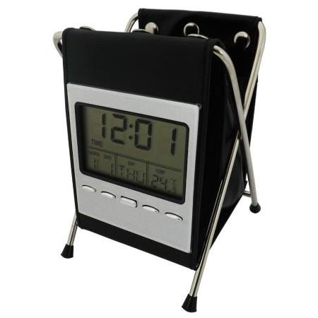 Porta caneta com relógio digital. Material metal com couro sintético.