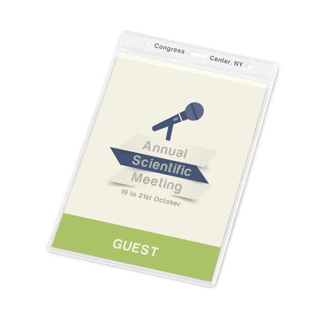 Porta crachás identificador vertical em PVC. Bolsa com furos para usar com mosquetão. 110 x 170 mm