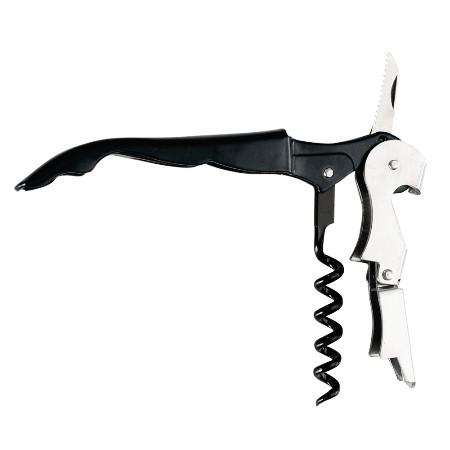 Saca-rolhas metálico de 2 estágios com acabamento brilhante. Contém abridor de garrafa, lâmina de corte e saca-rolhas.