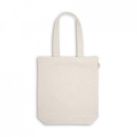 Sacola em 70% algodão reciclado e 30% poliéster reciclado (220g/m²), com alças de 65 cm. O tecido é sem tingimento, é utilizado na sua cor original, sem produtos químicos de tingimento ou branqueamento, contribuindo para um menor impacto ambiental. 380 x 420 x 100 mm