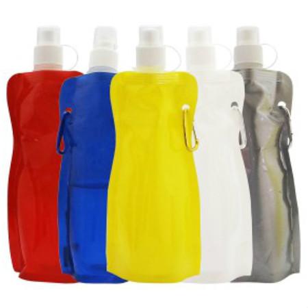 Squeeze de plástico flexível (dobrável), com mosquetão, com capacidade de 480 ml. Disponível em diversas cores.